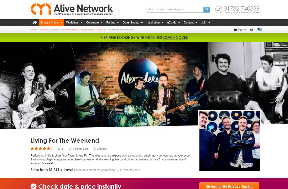 RISK FREE BOOKING: Find us on Alive Network, the UK’s largest supplier of live entertainment for weddings, corporate entertainment and private parties.